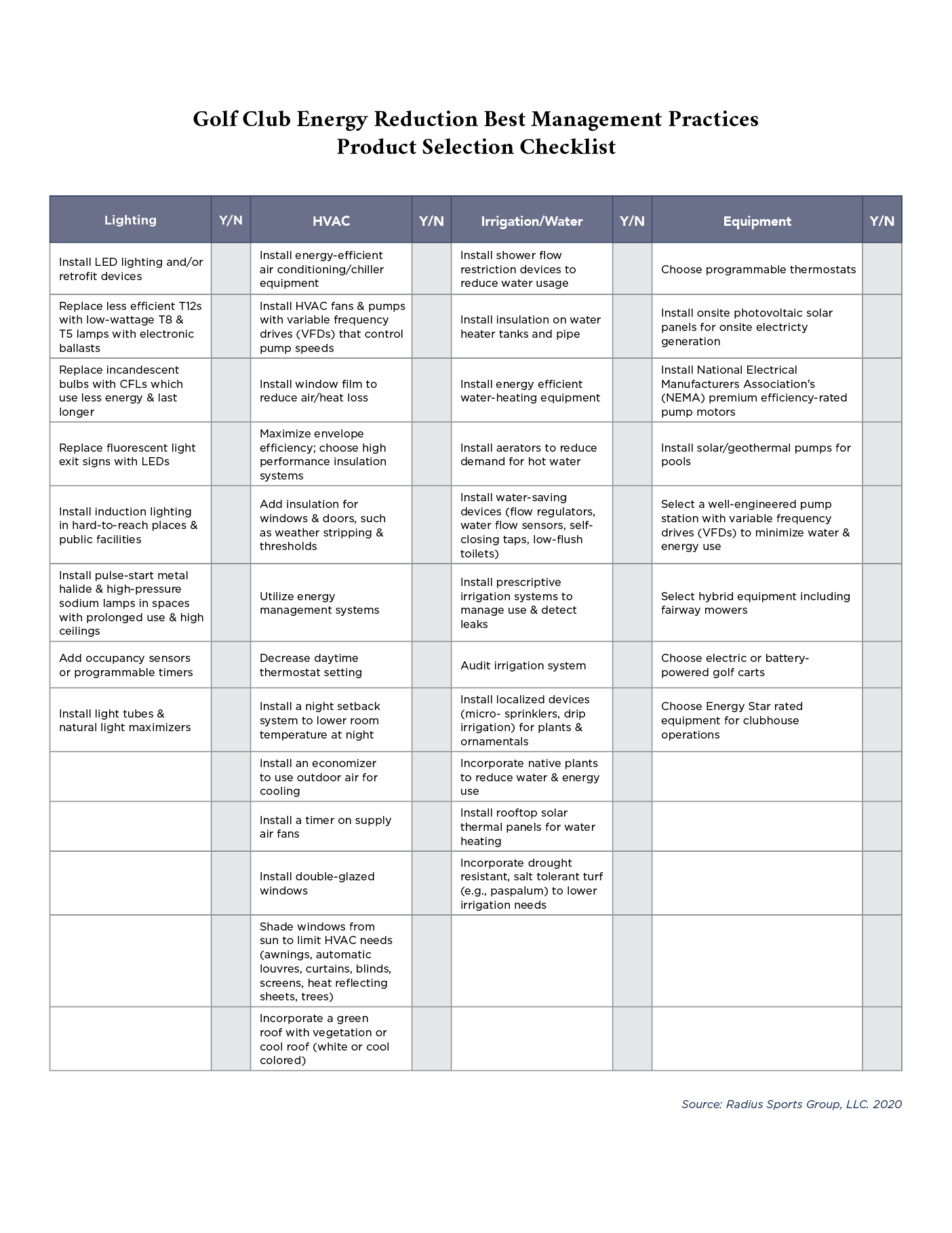Create a checklist of energy reduction product selection best management practices for the clubhouse, golf maintenance facility, and other buildings on property. This can be used as a self-audit and guide toward continuous improvement. Sample checklist below and reference Hawaiian Electric General Best Practices in Appendix B.